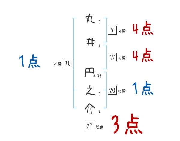 天運![]() | 丸井円之介さんの天運は7画の4つ星!強い意志や信念を持ち独立心が強い。自立する。 家系が持つ宿命的な運勢を表します。祖先から受け継いだ苗字ですので自分の力が及びません。家柄を象徴します。 |