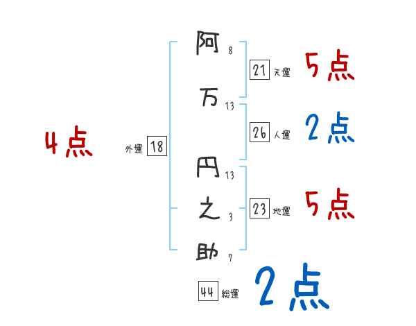 天運![]() | 阿万円之助さんの天運は21画の5つ星!統率力がある。独立し成功する。名誉を手に入れる。 家系が持つ宿命的な運勢を表します。祖先から受け継いだ苗字ですので自分の力が及びません。家柄を象徴します。 |