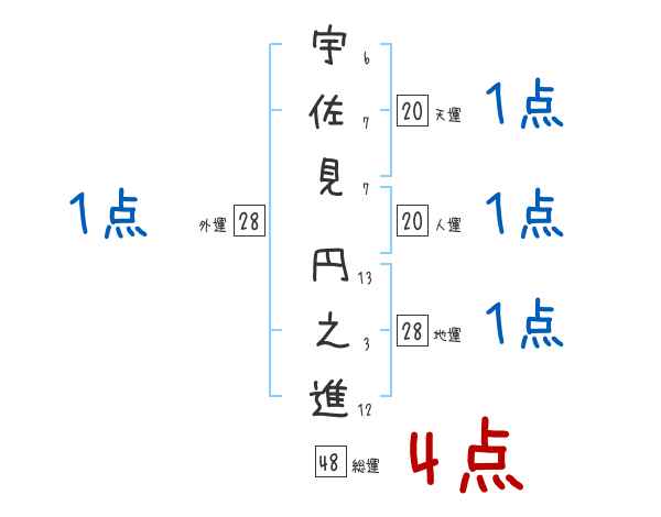 外運![]() | 宇佐見円之進さんの外運は28画の1つ星!家庭環境に注意。スポーツで活躍できる能力があるかも。 生活面を象徴する運勢です。外部から受ける影響力を表し、結婚運、家庭運や職場、環境への順応性を表します。 |