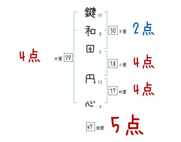総運![]() | 鍵和田円心さんの総運は47画の5つ星!実力が開花し発展する円満な人生。財に恵まれる。 あなたの人生を表す1番重要な運勢です。生涯を通じて影響する総合運となり、主に50歳以降の晩年期に影響を及ぼします。 |