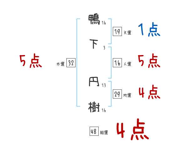 外運![]() | 鴨下円樹さんの外運は32画の5つ星!柔軟性があり成功する。チャンスが多く金運が良い。 生活面を象徴する運勢です。外部から受ける影響力を表し、結婚運、家庭運や職場、環境への順応性を表します。 |