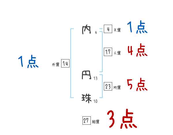 天運![]() | 内円珠さんの天運は4画の1つ星!感情が不安定で苦労するかも。周囲との協調を心掛けましょう。 家系が持つ宿命的な運勢を表します。祖先から受け継いだ苗字ですので自分の力が及びません。家柄を象徴します。 |