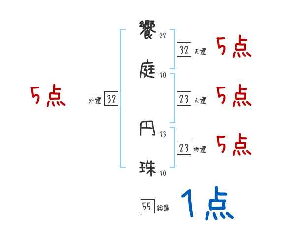 外運![]() | 饗庭円珠さんの外運は32画の5つ星!柔軟性があり成功する。チャンスが多く金運が良い。 生活面を象徴する運勢です。外部から受ける影響力を表し、結婚運、家庭運や職場、環境への順応性を表します。 |