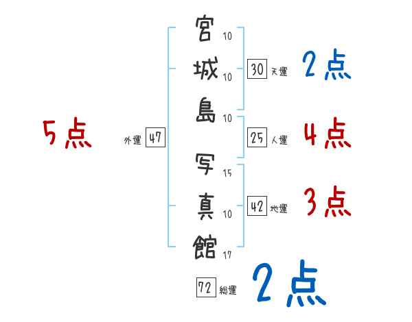 外運![]() | 宮城島写真館さんの外運は47画の5つ星!実力が開花し発展する円満な人生。財に恵まれる。 生活面を象徴する運勢です。外部から受ける影響力を表し、結婚運、家庭運や職場、環境への順応性を表します。 |