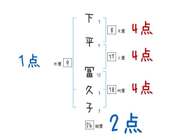 外運![]() | 下平冨久子さんの外運は9画の1つ星!消極的で才能を発揮することが苦手なことも。周りの意見に耳を傾けましょう。 生活面を象徴する運勢です。外部から受ける影響力を表し、結婚運、家庭運や職場、環境への順応性を表します。 |