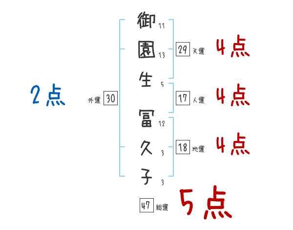 総運![]() | 御園生冨久子さんの総運は47画の5つ星!実力が開花し発展する円満な人生。財に恵まれる。 あなたの人生を表す1番重要な運勢です。生涯を通じて影響する総合運となり、主に50歳以降の晩年期に影響を及ぼします。 |