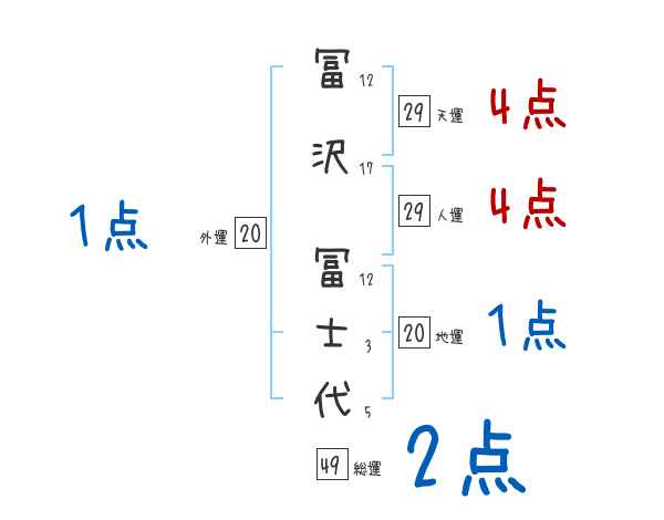 天運![]() | 冨沢冨士代さんの天運は29画の4つ星!完全主義で才能がある。厳格な心の持ち主。 家系が持つ宿命的な運勢を表します。祖先から受け継いだ苗字ですので自分の力が及びません。家柄を象徴します。 |