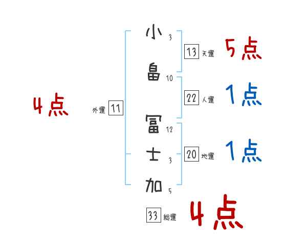 天運![]() | 小畠冨士加さんの天運は13画の5つ星!才能に恵まれ人気がある。名声を手に入れる。円満な人生。 家系が持つ宿命的な運勢を表します。祖先から受け継いだ苗字ですので自分の力が及びません。家柄を象徴します。 |