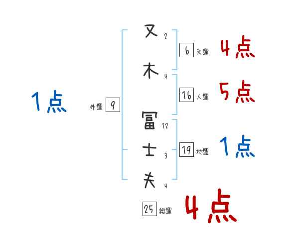 天運![]() | 又木冨士夫さんの天運は6画の4つ星!慎重な努力家で信頼を得る。誠実な精神で向上心に優れる。 家系が持つ宿命的な運勢を表します。祖先から受け継いだ苗字ですので自分の力が及びません。家柄を象徴します。 |