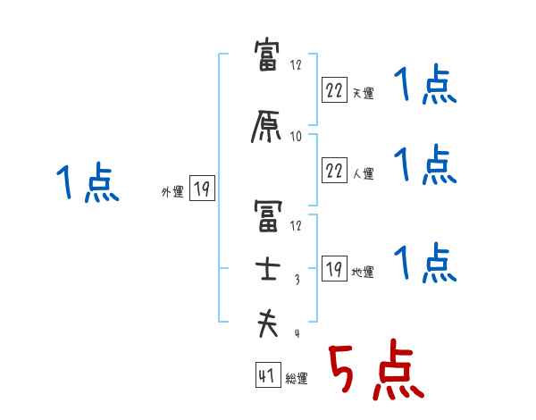 天運![]() | 富原冨士夫さんの天運は22画の1つ星!努力することが苦手ないっぽう手先が器用。芸術性にも優れる。 家系が持つ宿命的な運勢を表します。祖先から受け継いだ苗字ですので自分の力が及びません。家柄を象徴します。 |