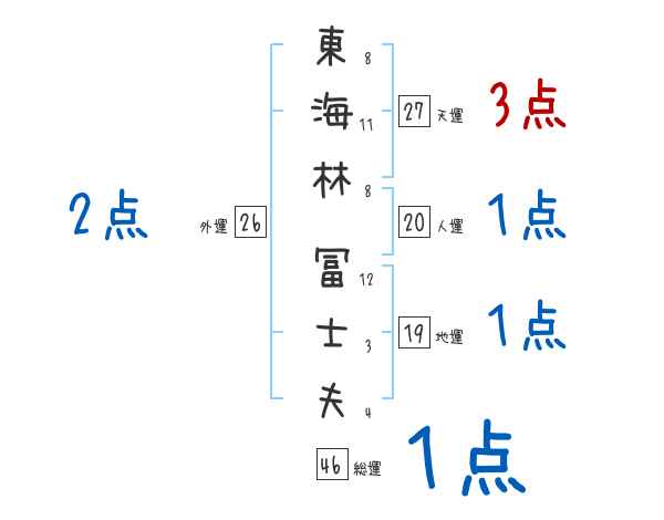 外運![]() | 東海林冨士夫さんの外運は26画の2つ星!波瀾万丈かも。信頼できる人を大事にしましょう。 生活面を象徴する運勢です。外部から受ける影響力を表し、結婚運、家庭運や職場、環境への順応性を表します。 |