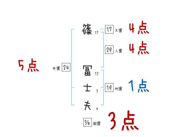 外運![]() | 篠冨士夫さんの外運は24画の5つ星!家庭運が良く順調な人生。金運にも恵まれる。 生活面を象徴する運勢です。外部から受ける影響力を表し、結婚運、家庭運や職場、環境への順応性を表します。 |