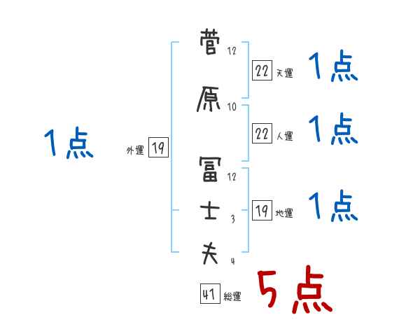 外運![]() | 菅原冨士夫さんの外運は19画の1つ星!優れた才能を持ちますが、協調性が足りないことも。周りの人と協力する事を意識しましょう。 生活面を象徴する運勢です。外部から受ける影響力を表し、結婚運、家庭運や職場、環境への順応性を表します。 |