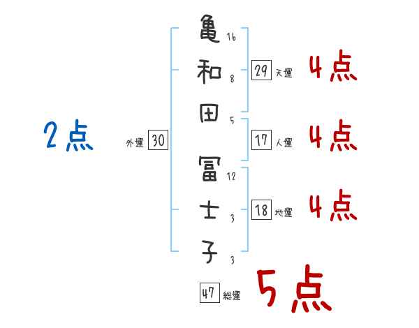 総運![]() | 亀和田冨士子さんの総運は47画の5つ星!実力が開花し発展する円満な人生。財に恵まれる。 あなたの人生を表す1番重要な運勢です。生涯を通じて影響する総合運となり、主に50歳以降の晩年期に影響を及ぼします。 |