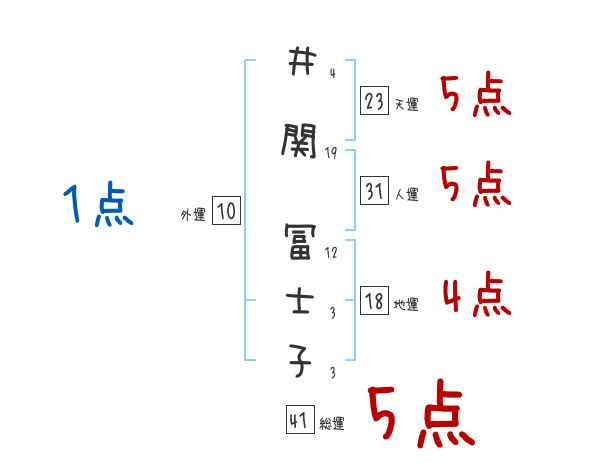 天運![]() | 井関冨士子さんの天運は23画の5つ星!想像力に優れ活力がある。一代で成功し名誉を手に入れる。 家系が持つ宿命的な運勢を表します。祖先から受け継いだ苗字ですので自分の力が及びません。家柄を象徴します。 |