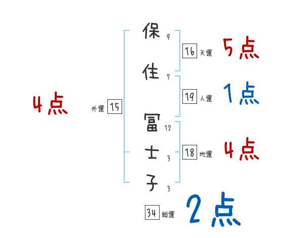天運![]() | 保住冨士子さんの天運は16画の5つ星!人望が厚く大きく発展する。逆転成功が見える。 家系が持つ宿命的な運勢を表します。祖先から受け継いだ苗字ですので自分の力が及びません。家柄を象徴します。 |