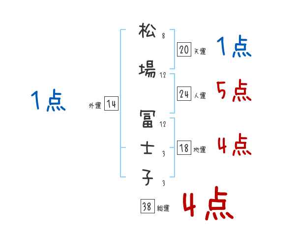 人運![]() | 松場冨士子さんの人運は24画の5つ星!家庭運が良く順調な人生。金運にも恵まれる。 性格や才能などを表す2番目に重要な運勢です。人間関係や協調性、社会的な成功に影響します。主に20歳から50歳ぐらいまでの中年期の運勢を表します。 |
