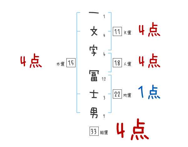 天運![]() | 一文字冨士男さんの天運は11画の4つ星!着実に富や地位を得る幸運な人生。 家系が持つ宿命的な運勢を表します。祖先から受け継いだ苗字ですので自分の力が及びません。家柄を象徴します。 |