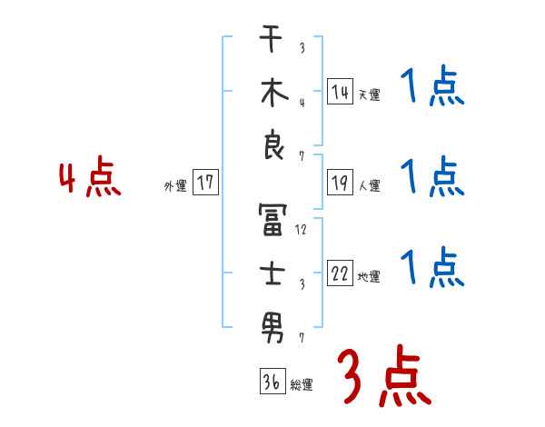 外運![]() | 千木良冨士男さんの外運は17画の4つ星!積極的な行動力。地位を気づき財産を手に入れる。純粋な心と直感力。 生活面を象徴する運勢です。外部から受ける影響力を表し、結婚運、家庭運や職場、環境への順応性を表します。 |