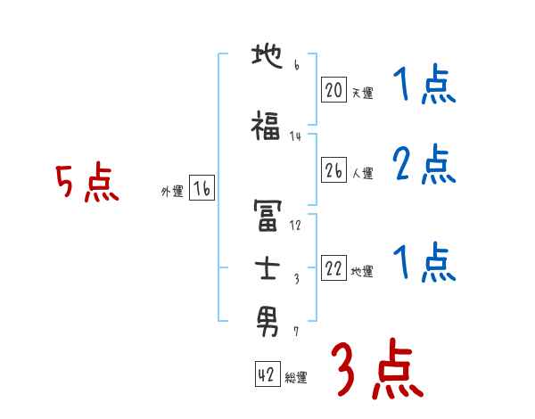 外運![]() | 地福冨士男さんの外運は16画の5つ星!人望が厚く大きく発展する。逆転成功が見える。 生活面を象徴する運勢です。外部から受ける影響力を表し、結婚運、家庭運や職場、環境への順応性を表します。 |