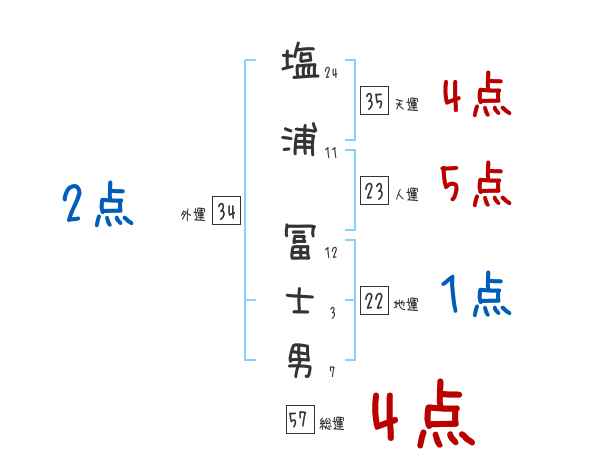 天運![]() | 塩浦冨士男さんの天運は35画の4つ星!温厚な性格で感受性が高い。穏和な性格で人望が厚い。 家系が持つ宿命的な運勢を表します。祖先から受け継いだ苗字ですので自分の力が及びません。家柄を象徴します。 |