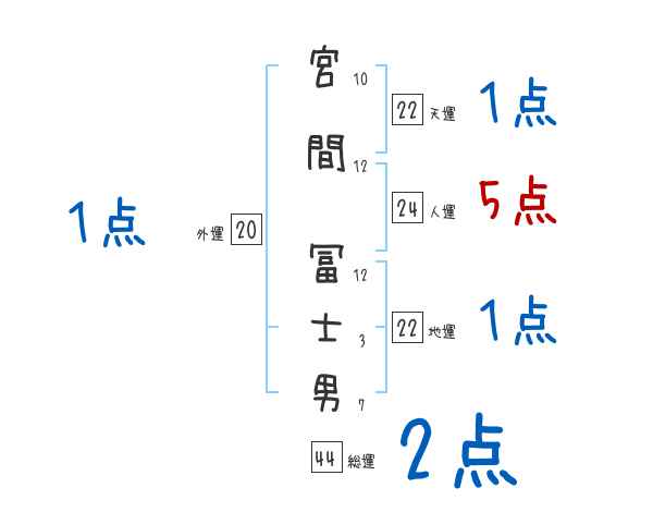 天運![]() | 宮間冨士男さんの天運は22画の1つ星!努力することが苦手ないっぽう手先が器用。芸術性にも優れる。 家系が持つ宿命的な運勢を表します。祖先から受け継いだ苗字ですので自分の力が及びません。家柄を象徴します。 |
