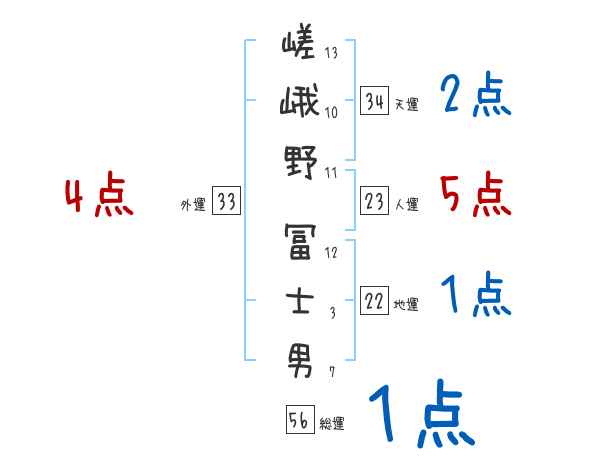 外運![]() | 嵯峨野冨士男さんの外運は33画の4つ星!権力志向でプライドが高い。勇気があり運を切り開き成功する。 生活面を象徴する運勢です。外部から受ける影響力を表し、結婚運、家庭運や職場、環境への順応性を表します。 |