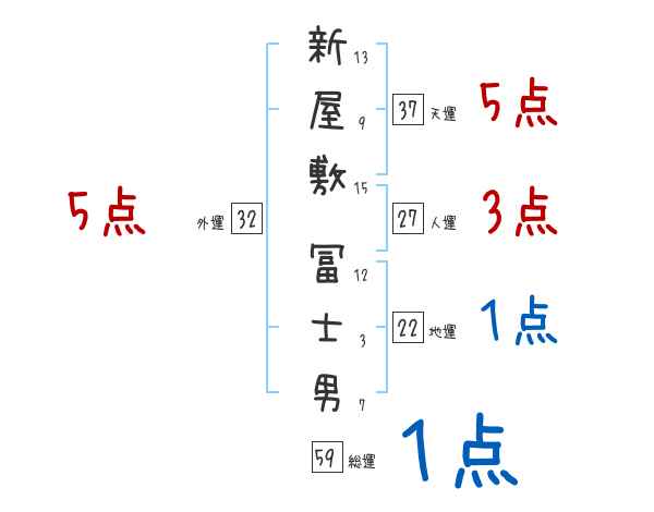 外運![]() | 新屋敷冨士男さんの外運は32画の5つ星!柔軟性があり成功する。チャンスが多く金運が良い。 生活面を象徴する運勢です。外部から受ける影響力を表し、結婚運、家庭運や職場、環境への順応性を表します。 |