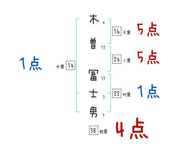 | 外運  | 木曽冨士男さんの外運は14画の1つ星!人に対して優しいがストレスを溜め込みがち。人間関係のトラブルを避けるよう気をつけましょう。生活面を象徴する運勢です。外部から受ける影響力を表し、結婚運、家庭運や職場、環境への順応性を表します。 |