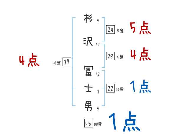 天運![]() | 杉沢冨士男さんの天運は24画の5つ星!家庭運が良く順調な人生。金運にも恵まれる。 家系が持つ宿命的な運勢を表します。祖先から受け継いだ苗字ですので自分の力が及びません。家柄を象徴します。 |