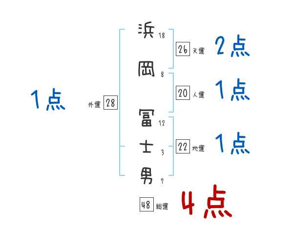 天運![]() | 浜岡冨士男さんの天運は26画の2つ星!波瀾万丈かも。信頼できる人を大事にしましょう。 家系が持つ宿命的な運勢を表します。祖先から受け継いだ苗字ですので自分の力が及びません。家柄を象徴します。 |