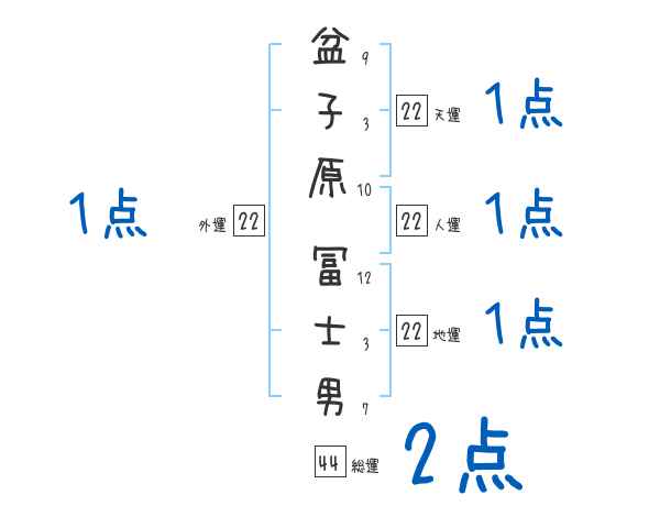 人運![]() | 盆子原冨士男さんの人運は22画の1つ星!努力することが苦手ないっぽう手先が器用。芸術性にも優れる。 性格や才能などを表す2番目に重要な運勢です。人間関係や協調性、社会的な成功に影響します。主に20歳から50歳ぐらいまでの中年期の運勢を表します。 |