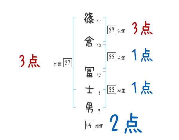 天運![]() | 篠倉冨士男さんの天運は27画の3つ星!頭脳明晰だが強情で摩擦が多い傾向。孤立に注意。 家系が持つ宿命的な運勢を表します。祖先から受け継いだ苗字ですので自分の力が及びません。家柄を象徴します。 |