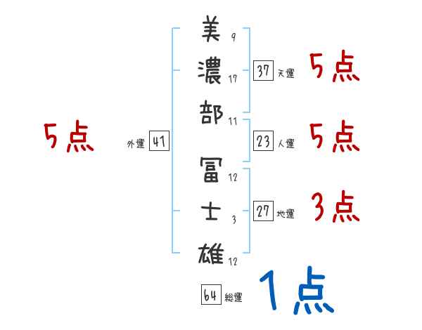 地運![]() | 美濃部冨士雄さんの地運は27画の3つ星!頭脳明晰だが強情で摩擦が多い傾向。孤立に注意。 個性を表す基礎的な運勢です。性格形成や対人関係、行動力など家庭環境に影響されます。主に誕生してから20歳くらいまでの若年期の運勢を表します。 |
