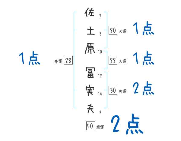 人運![]() | 佐土原冨実夫さんの人運は22画の1つ星!努力することが苦手ないっぽう手先が器用。芸術性にも優れる。 性格や才能などを表す2番目に重要な運勢です。人間関係や協調性、社会的な成功に影響します。主に20歳から50歳ぐらいまでの中年期の運勢を表します。 |