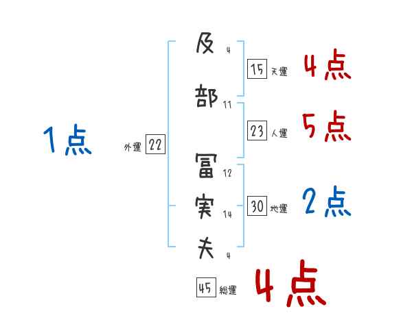 外運![]() | 及部冨実夫さんの外運は22画の1つ星!努力することが苦手ないっぽう手先が器用。芸術性にも優れる。 生活面を象徴する運勢です。外部から受ける影響力を表し、結婚運、家庭運や職場、環境への順応性を表します。 |