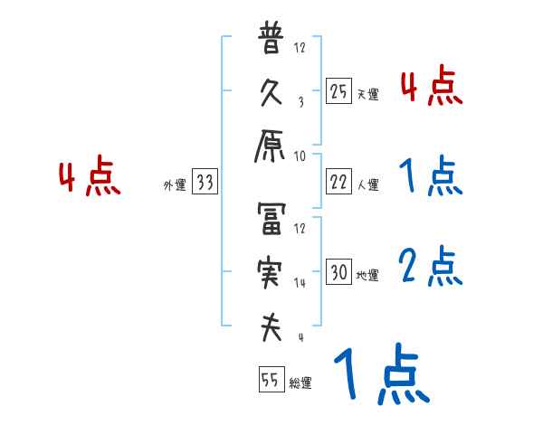 総運![]() | 普久原冨実夫さんの総運は55画の1つ星!欲張りな性格で軽率な行動に注意しましょう。病気に気をつけて。 あなたの人生を表す1番重要な運勢です。生涯を通じて影響する総合運となり、主に50歳以降の晩年期に影響を及ぼします。 |