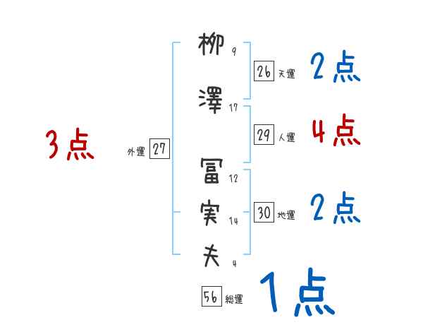 天運![]() | 栁澤冨実夫さんの天運は26画の2つ星!波瀾万丈かも。信頼できる人を大事にしましょう。 家系が持つ宿命的な運勢を表します。祖先から受け継いだ苗字ですので自分の力が及びません。家柄を象徴します。 |