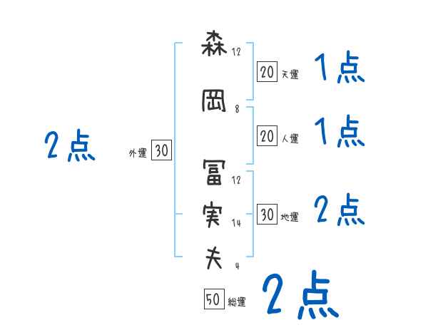 総運![]() | 森岡冨実夫さんの総運は50画の2つ星!浮き沈みが激しく不安定。しりすぼみに衰退しやすいので注意しましょう。 あなたの人生を表す1番重要な運勢です。生涯を通じて影響する総合運となり、主に50歳以降の晩年期に影響を及ぼします。 |