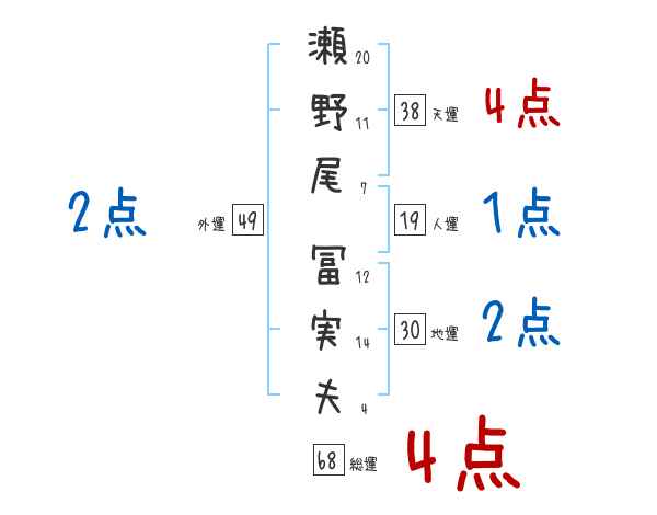 総運![]() | 瀬野尾冨実夫さんの総運は68画の4つ星!潜在能力が高く集中力が高い。勤勉に励み発展する。 あなたの人生を表す1番重要な運勢です。生涯を通じて影響する総合運となり、主に50歳以降の晩年期に影響を及ぼします。 |