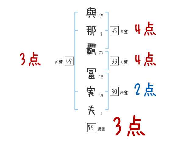 総運![]() | 與那覇冨実夫さんの総運は75画の3つ星!慎重な性格で保守的。 あなたの人生を表す1番重要な運勢です。生涯を通じて影響する総合運となり、主に50歳以降の晩年期に影響を及ぼします。 |