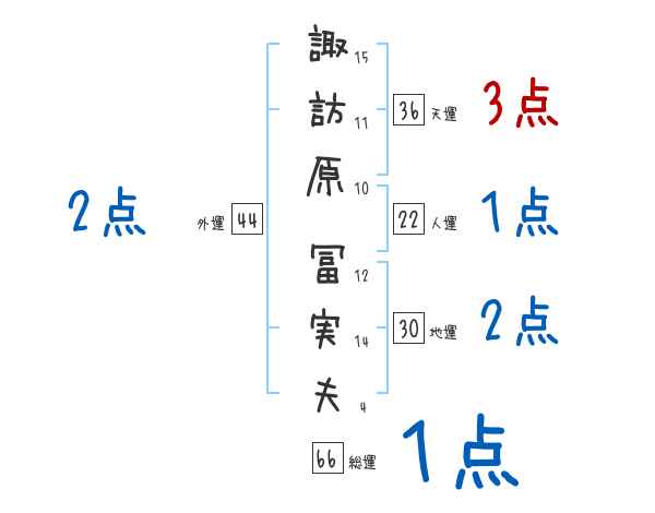 天運![]() | 諏訪原冨実夫さんの天運は36画の3つ星!先見性が豊かです。多少神経質で苦労することも。 家系が持つ宿命的な運勢を表します。祖先から受け継いだ苗字ですので自分の力が及びません。家柄を象徴します。 |