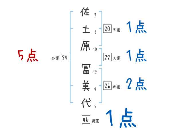 外運![]() | 佐土原冨美代さんの外運は24画の5つ星!家庭運が良く順調な人生。金運にも恵まれる。 生活面を象徴する運勢です。外部から受ける影響力を表し、結婚運、家庭運や職場、環境への順応性を表します。 |
