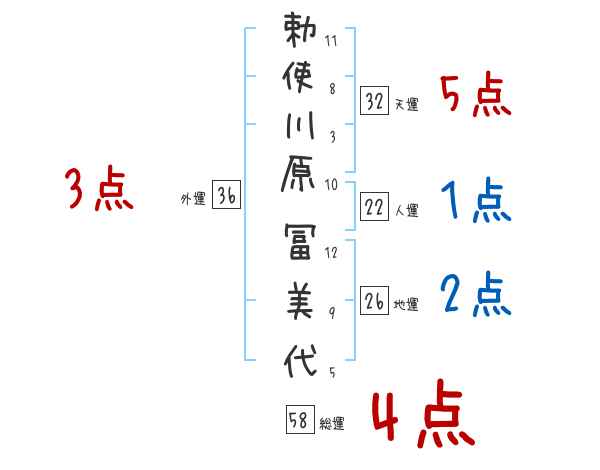 天運![]() | 勅使川原冨美代さんの天運は32画の5つ星!柔軟性があり成功する。チャンスが多く金運が良い。 家系が持つ宿命的な運勢を表します。祖先から受け継いだ苗字ですので自分の力が及びません。家柄を象徴します。 |