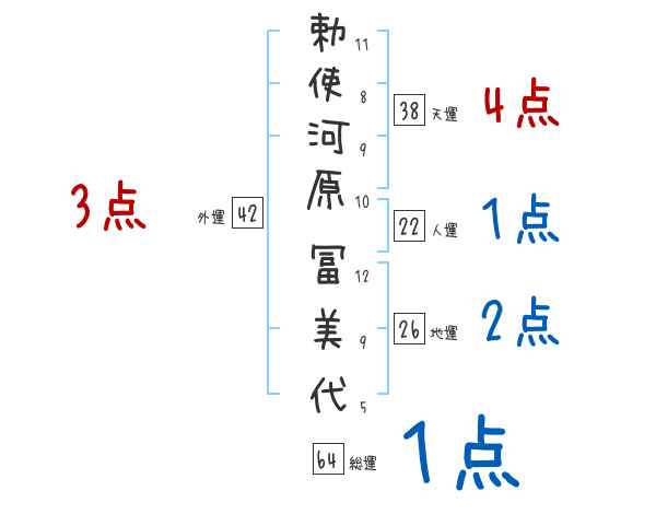 外運![]() | 勅使河原冨美代さんの外運は42画の3つ星!病気に注意。多芸であるが消極的でおとなしい。 生活面を象徴する運勢です。外部から受ける影響力を表し、結婚運、家庭運や職場、環境への順応性を表します。 |