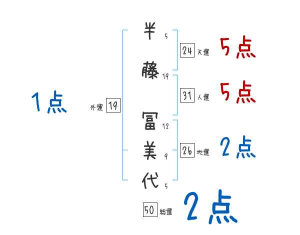 外運![]() | 半藤冨美代さんの外運は19画の1つ星!優れた才能を持ちますが、協調性が足りないことも。周りの人と協力する事を意識しましょう。 生活面を象徴する運勢です。外部から受ける影響力を表し、結婚運、家庭運や職場、環境への順応性を表します。 |