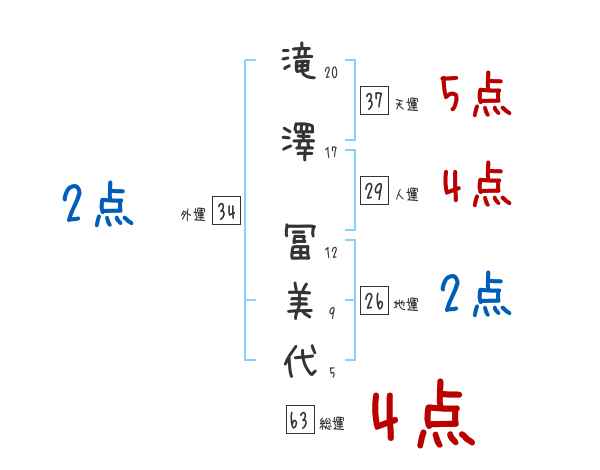 総運![]() | 滝澤冨美代さんの総運は63画の4つ星!家庭運がよく順調な生活。温和な性格。 あなたの人生を表す1番重要な運勢です。生涯を通じて影響する総合運となり、主に50歳以降の晩年期に影響を及ぼします。 |