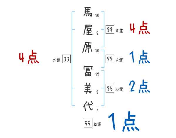 人運![]() | 馬屋原冨美代さんの人運は22画の1つ星!努力することが苦手ないっぽう手先が器用。芸術性にも優れる。 性格や才能などを表す2番目に重要な運勢です。人間関係や協調性、社会的な成功に影響します。主に20歳から50歳ぐらいまでの中年期の運勢を表します。 |