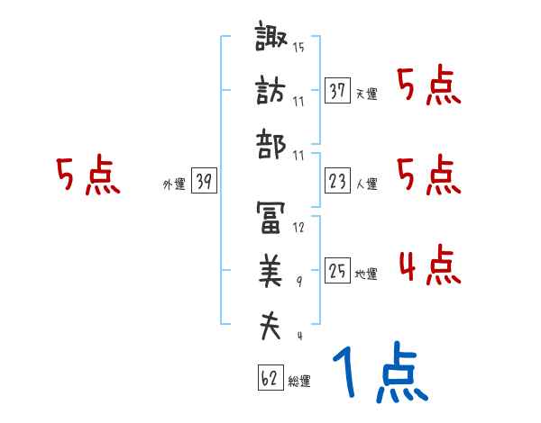 総運![]() | 諏訪部冨美夫さんの総運は62画の1つ星!困難なトラブルが多く精神的に疲労しないように気をつけましょう。 あなたの人生を表す1番重要な運勢です。生涯を通じて影響する総合運となり、主に50歳以降の晩年期に影響を及ぼします。 |