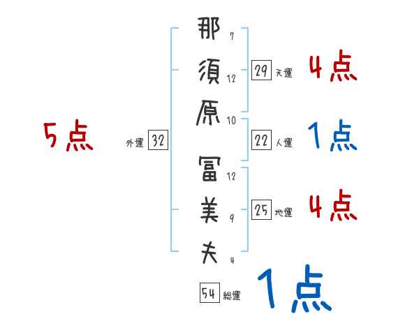外運![]() | 那須原冨美夫さんの外運は32画の5つ星!柔軟性があり成功する。チャンスが多く金運が良い。 生活面を象徴する運勢です。外部から受ける影響力を表し、結婚運、家庭運や職場、環境への順応性を表します。 |